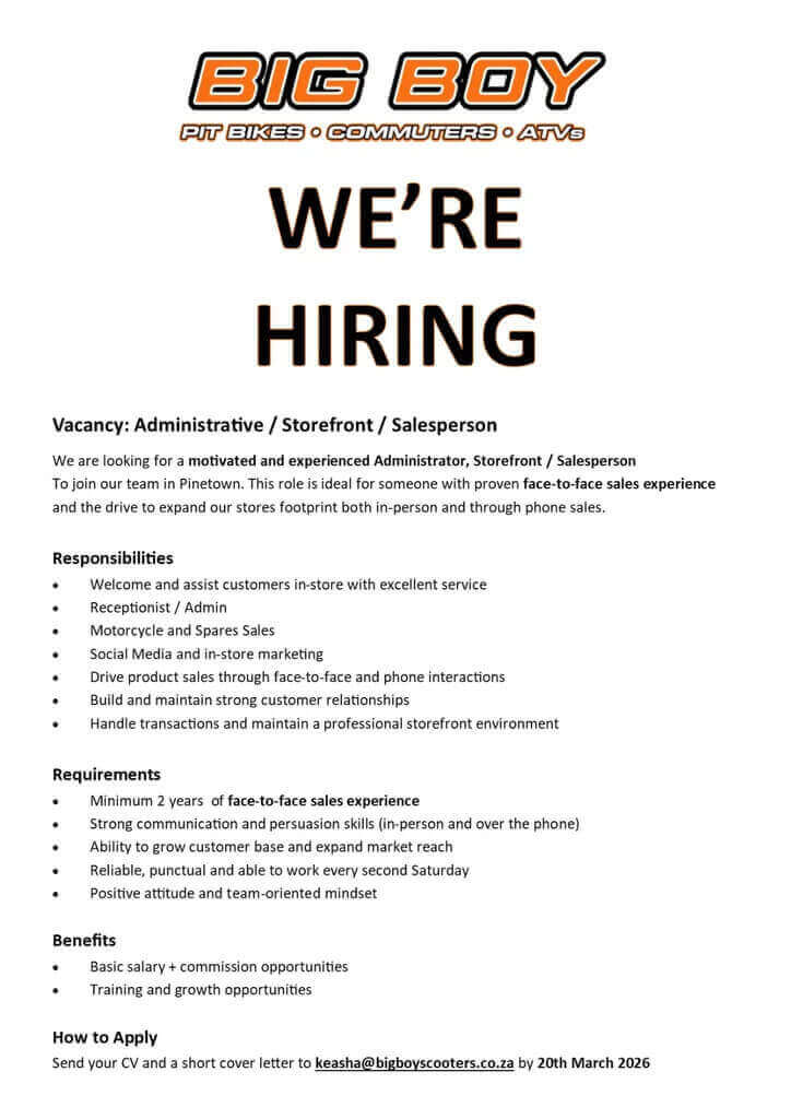 To join our team in Pinetown. This role is ideal for someone with proven face-to-face sales experience and the drive to expand our stores footprint both in-person and through phone sales.